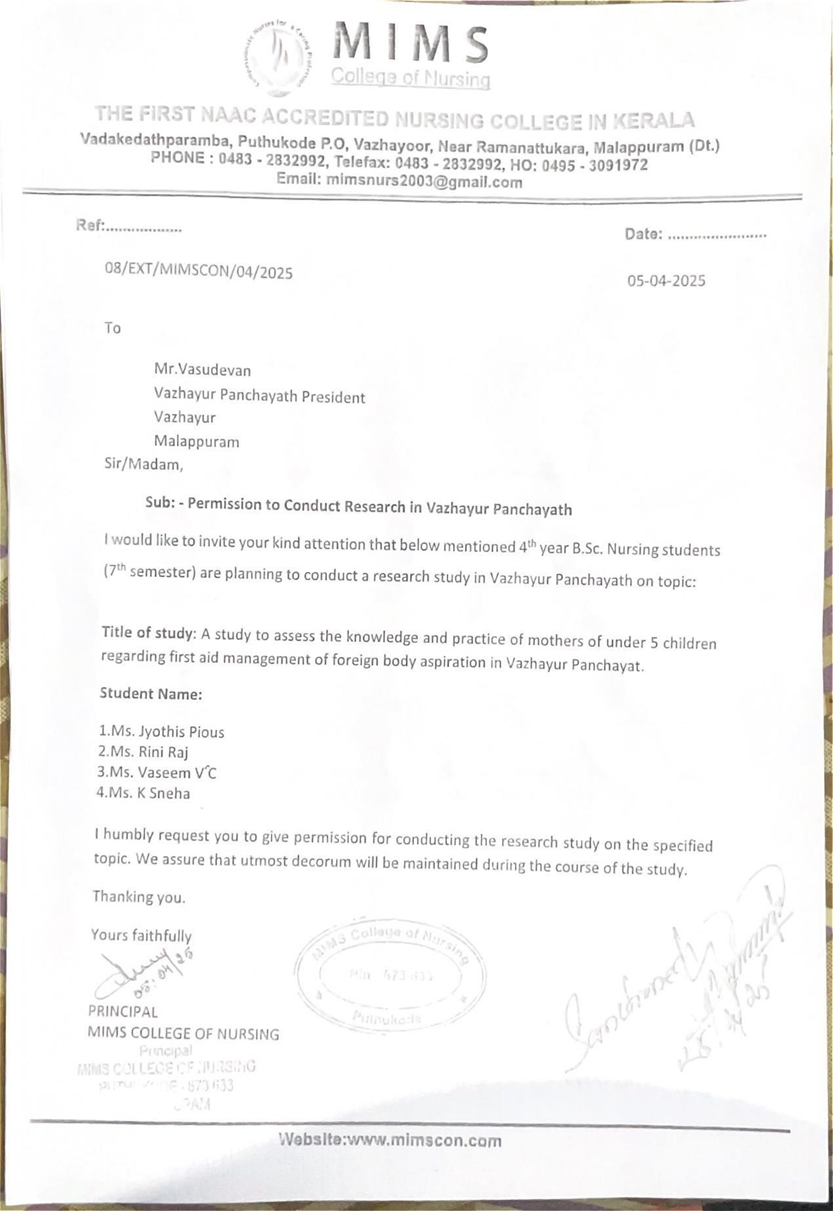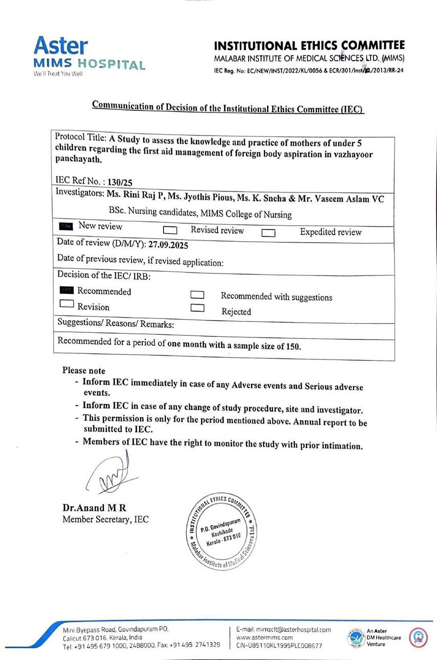 A study to assess the knowledge and practice of mothers of under five children regarding the first aid management of foreign body aspiration in Vazhayur Panchyath.