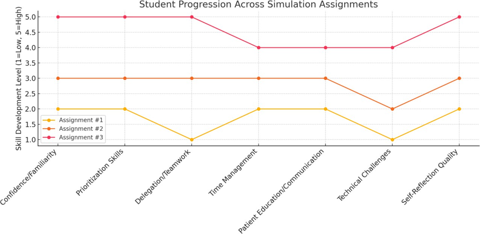 The VR simulation clinicals were implemented as a teaching method when it became evident that there was a shortage in the number of critical care clinical sites available for senior nursing student placement. The faculty was concerned about replacing clinical hours with simulation hours. However, as noted in Figure #1 and Figure#2, senior nursing students reported an increase in confidence from low-moderate to high from assignments one to three, respectively using this planned alternative learning method. In addition, students reported prioritization skills improving from “emerging” to “strong” by the end of assignment three. Delegation, team work, and time management skills also improved with each assignment. Interestingly, students reported improved communication skills including those required for patient education with the VR simulation clinicals.